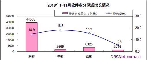 三、分地区运行情况 中、西部地区软件业务收入保持较快增速,东部地区增速有所回落。1-11月,中部和西部地区完成软件业务收入分别为2669和6325亿元,同比分别增长18.3%和15.5%,增速比1-10月提高0.7和0.2个百分点,中西部软件业务收入合计占全国的比重为16%。东部地区完成软件业务收入44553亿元,同比增长14.9%,增速同比提高0.7个百分点,但比1-10月回落0.4个百分点,占全国软件业务收入的比重为79.4%。东北地区完成软件业务收入2546亿元,同比增长5.6%,增速同比回落2.3个百分点,比1-10月回落2.8个百分点。