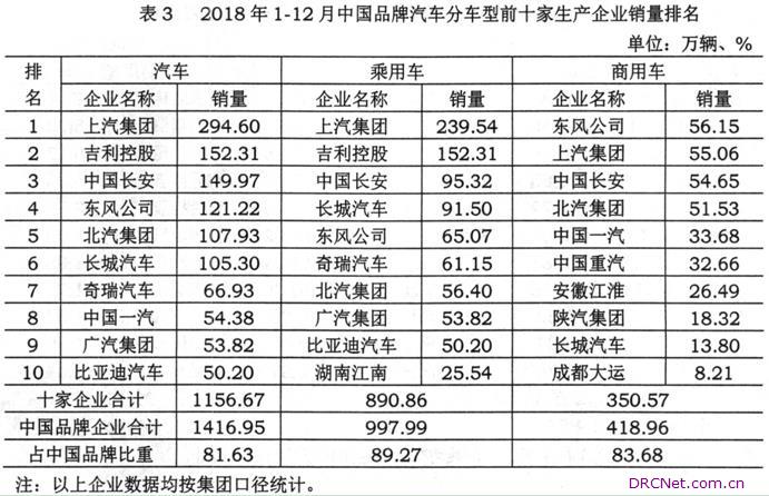 1-12月,中国品牌汽车销量排名前十家企业依次是:上汽、吉利、长安、东风、北汽、长城、奇瑞、一汽、广汽和比亚迪。与上年同期相比,比亚迪、吉利和奇瑞销量增速较快,上汽和广汽增速略低,其他五家企业呈一定下降,东风和北汽降幅居前。1-12月,上述十家企业共销售1156.67万辆,占中国品牌汽车销售总量的81.63%。