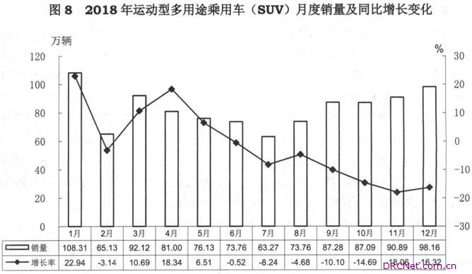 从SUV产销月度变化趋势来看,前5月除2月有所下降外,其他各月总体仍然保持了稳定增长,但进入6月后同比逐月下降;全年仅1月销量超过百万,此后各月销量均未超过1月,市场发展乏力态势日益显现。