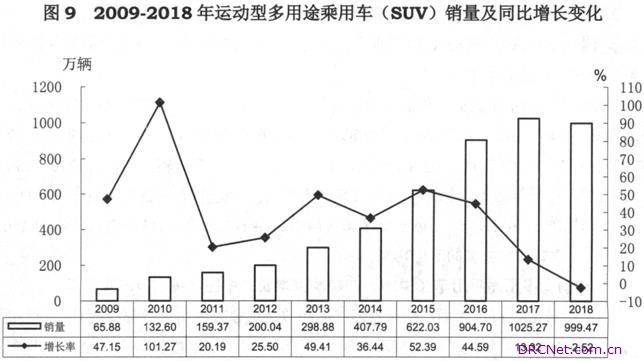 近几年,SUV市场竞争日趋激烈但产品同质化现象较为明显,与此同时,受节能环保、交通拥堵等外部环境日趋严格的要求,SUV产销结束了快速增长势头,呈一定下降。2018年,运动型多用途乘用车(SUV)产销分别为995.86万辆和999.47万辆,同比下降3.19%和2.52%,占乘用车产销比重分别达到42.32%和42.15%。