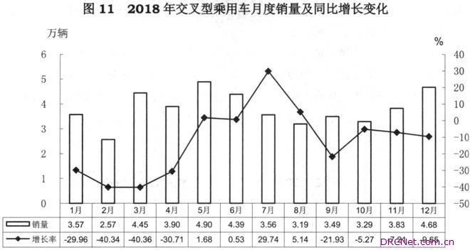 2018年,交叉型乘用车产销分别达到42.01万辆和45.26万辆,同比下降20.75%和17.26%。从交叉型乘用车全年月度销量同比增长变化来看,1-4月仍然维持了快速下降趋势,进入5月后有所增长,市场需求在一定程度上得到恢复性增长,但9月后销量同比再次下降,市场重新呈现低迷发展态势。