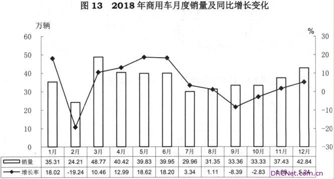 2018年,商用车产销分别达到427.98万辆和437.08万辆,同比增长1.69%和5.05%,增速分别比上年回落12.13个百分点和8.90个百分点。从商用车月度销售情况来看,上半年除2月同比有所下降外,其他各月继续保持两位数较快增长;7月后同比增速明显回落,9月-10月同比再度下降,11月-12月小幅回升。