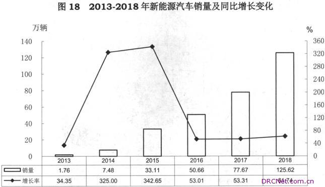 2018年,新能源汽车产销分别达到127.05万辆和125.62万辆,同比增长59.92%和61.74%。其中纯电动汽车产销分别完成98.56万辆和98.37万辆,同比增长47.85%和50.83%;插电式混合动力汽车产销分别完成28.33万辆和27.09万辆,同比增长121.97%和117.98%。