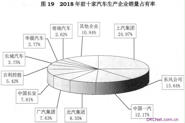 2018年,对于汽车工业发展来说是一个不平凡的一年,但行业内骨干企业依然起到了“中流砥柱”的作用。更为可喜的是,这一年汽车行业大型企业集团进一步加大了合作力度,由以前的“单打独斗”转化为“抱团取暖”,一些曾经是竞争对手的企业也“化干戈为玉帛”,开创了战略合作新局面。为了推动新能源汽车产业健康发展,行业内骨干企业不仅加快了与国内优势企业的联合发展步伐,与此同时也拓展和加深了与跨国公司的合资力度。综上所述,尽管在2018年汽车市场遇冷,但行业内骨干企业发展势头不减,市场份额也继续保持了较高占有率,同时,随着市场竞争加剧,企业之间分化明显。2018年,汽车销量排名前十位的生产企业依次为:上汽、东风、一汽、北汽、广汽、长安、吉利、长城、华晨和奇瑞,分别销售701.25万辆、383.08万辆、341.84万辆、240.21万辆、214.28万辆、213.78万辆、152.31万辆、105.30万辆、77.86万辆和73.71万辆。与上年相比,长安销量下降较快,东风、北汽和长城降幅略低,其他六家企业呈不同程度增长,其中吉利增速更快。2018年,上述十家企业共销售2503.63万辆,占汽车销售总量的89.16%。