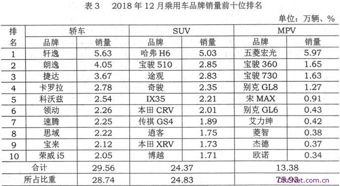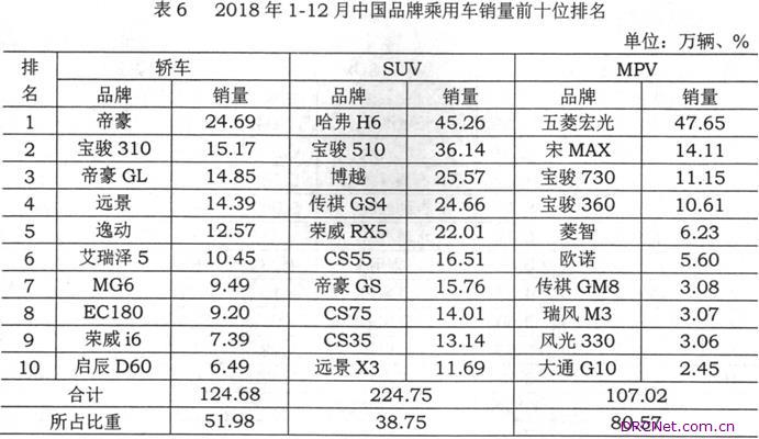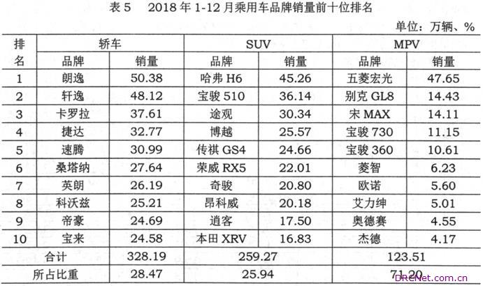 1-12月,乘用车共销售2370.98万辆,同比下降4.08%。其中:基本型乘用车(轿车)销售1152.78万辆,同比下降2.70%;运动型多用途乘用车(SUV)销售999.47万辆,同比下降2.52%;多功能乘用车(MPV)销售173.46万辆,同比下降16.22%;交叉型乘用车销售45.26万辆,同比下降17.26%。