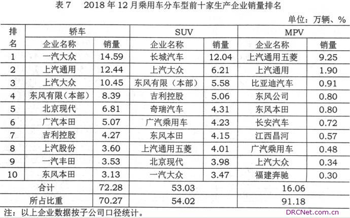 乘用车分车型生产企业销售情况:12月,销量排名前十位的轿车生产企业依次为:一汽大众、上汽通用、上汽大众、东风有限(本部)、北京现代、广汽本田、吉利控股、上汽股份、一汽丰田和东风本田。与上月相比,北京现代、上汽股份和东风本田销量呈较快增长,一汽大众和东风有限(本部)增速略低,其他企业均呈下降,吉利控股、上汽大众和一汽丰田降幅更为明显。12月,上述十家企业共销售72.28万辆,占轿车销售总量的70.27%。