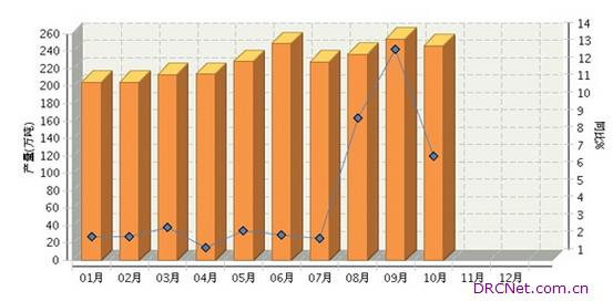 2015年1~10月我国乳制品累计产量同比增长4.27%