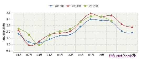 2015年10月全国动物玩具及玩偶行业累计完成出口额2.87亿美元,同比增长-12.73%,较9月份增速下降13.04个百分点,较2014年增速下降29.89个百分点。 2015年全国动物玩具及玩偶行业连续三年月度出口额对比