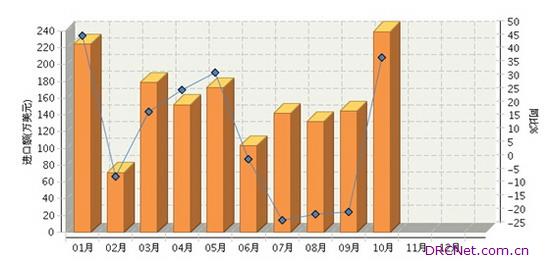 2015年1月~10月,全国婴孩车及其零件行业累计完成进口额1,554.06万美元,同比增长10.44%。其中:10月份完成进口额239.18万美元,同比增长40.04%,较9月份增速提高了57.62个百分点,较2014年同期增速提高了1.21个百分点。 2015年全国婴孩车及其零件行业月度进口额及同比