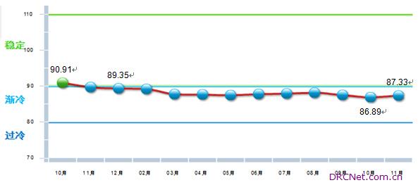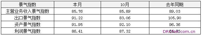 2016年1月6日,中国轻工业信息中心发布《2015年11月中国轻工业经济运行简报》,《简报》以国家统计局、海关总署的动态数据为基础,以中国轻工业经济运行及预测预警系统为平台,紧密结合轻工业运行基本情况,对轻工业经济运行态势加以分析研究。以下内容仅供参考。 中轻景气指数连续12个月在渐冷区间运行 一、中轻景气度走势分析 中国轻工业经济运行及预测预警系统数据显示,2015年11月中轻景气指数为87.33。近三年中轻景气指数呈现阶梯式下落走势,该指数自去年11月首次跌入渐冷区间以来,已连续12个月在蓝色渐冷区间运行,本月小幅上升0.44点,反映轻工运行情况有所回暖。 图1-1 2014年至2015年中轻景气指数走势 二、分项景气指数分析 从分指标运行指数来看,出口指数明显回升,其他三项指数小幅下降,其中:主营业务收入景气指数85.76,较10月下降0.13点,出口景气指数91.22,较10月上升8.16点,利润景气指数86.41,较10月下降0.91点。 表2-1 2015年11月份中轻分项景气指数