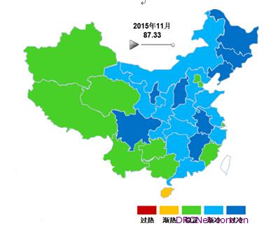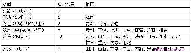2015年11月,中国轻工业信息中心对全国轻工行业25个行业进行监测,制糖、乐器等12个行业处于“稳定”区间,占比48%;自行车、缝纫机等12个行业处于“趋冷”区间,占48%;珠宝行业跌入“过冷”区间。整体行业景气情况如下: 表3-1 2015年11月轻工行业景气指数冷暖分布情况 四、地区景气指数分析 从分地区景气运行情况来看,在纳入监测的大陆地区31个省市自治区中,海南省处于“渐热”区间;青海、云南、新疆等10省处于“稳定”区间,占32.26%;江苏、山东、广东等12省位于“趋冷”区间,占38.71%;四川、山西、宁夏等8个省市位于 “过冷”区间,占25.81%。具体分布情况如下所示。 图4-1 2015年11月份中轻分地区景气指数冷暖示意图 表4-1 2015年11月份中轻分地区景气指数冷暖情况